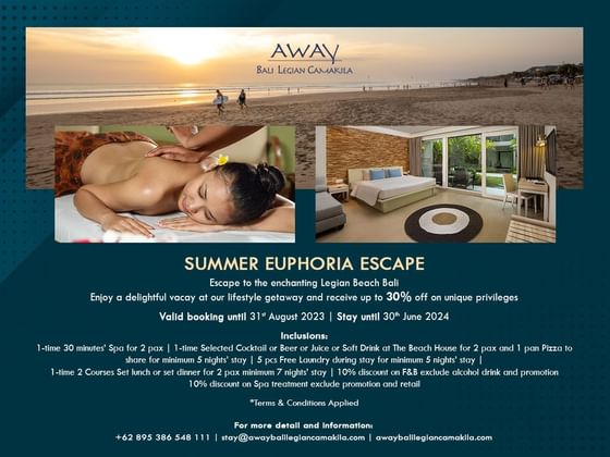 Escape your everyday life from a hustle-bustle with Away Bali Legian Camakila signature package. Treat yourself with an exclusive benefit minimum of 2 nights stay in our tropical spacious room. A complete holiday awaits you in Away Bali Legian Camakila